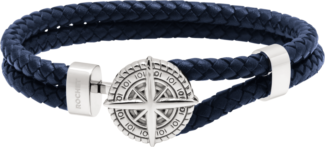 HB0806 CAPE HORN: 10MM POLISHED STEEL BRACELET WITH NAVY BLUE BRAIDED LEATHER STRAPS. 21CM, ONE SIZE. RRP $159
