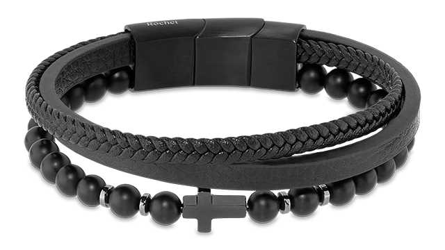 HB891201 Mysteres. 12mm Black Agate Beads, Black PU Leather Link, and Black IP Cross. Magnetic Clasp. 21CM Adjustable. RRP: 134.95.