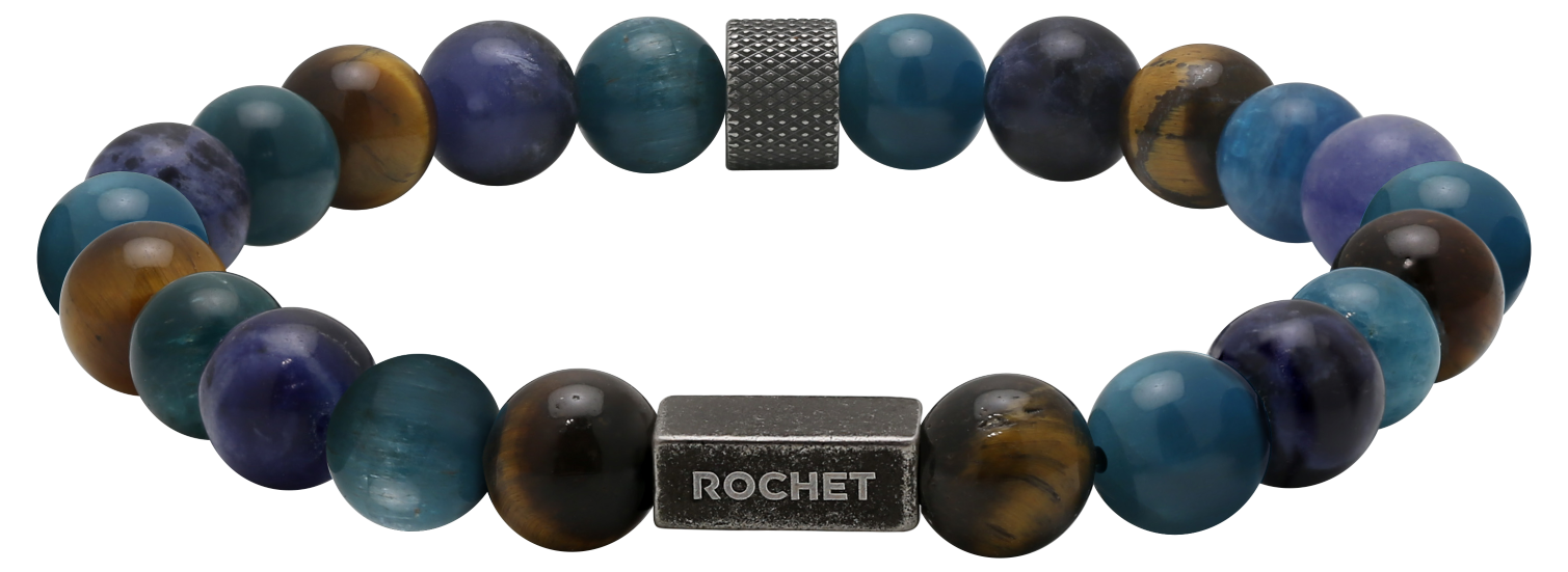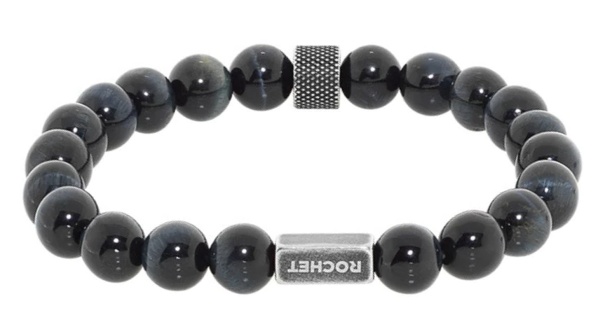 B28600103 ZEN: 8MM BLACK AGATES, TIGER EYES AND KNURLED STEEL ELASTIC BRACELET. RRP $85