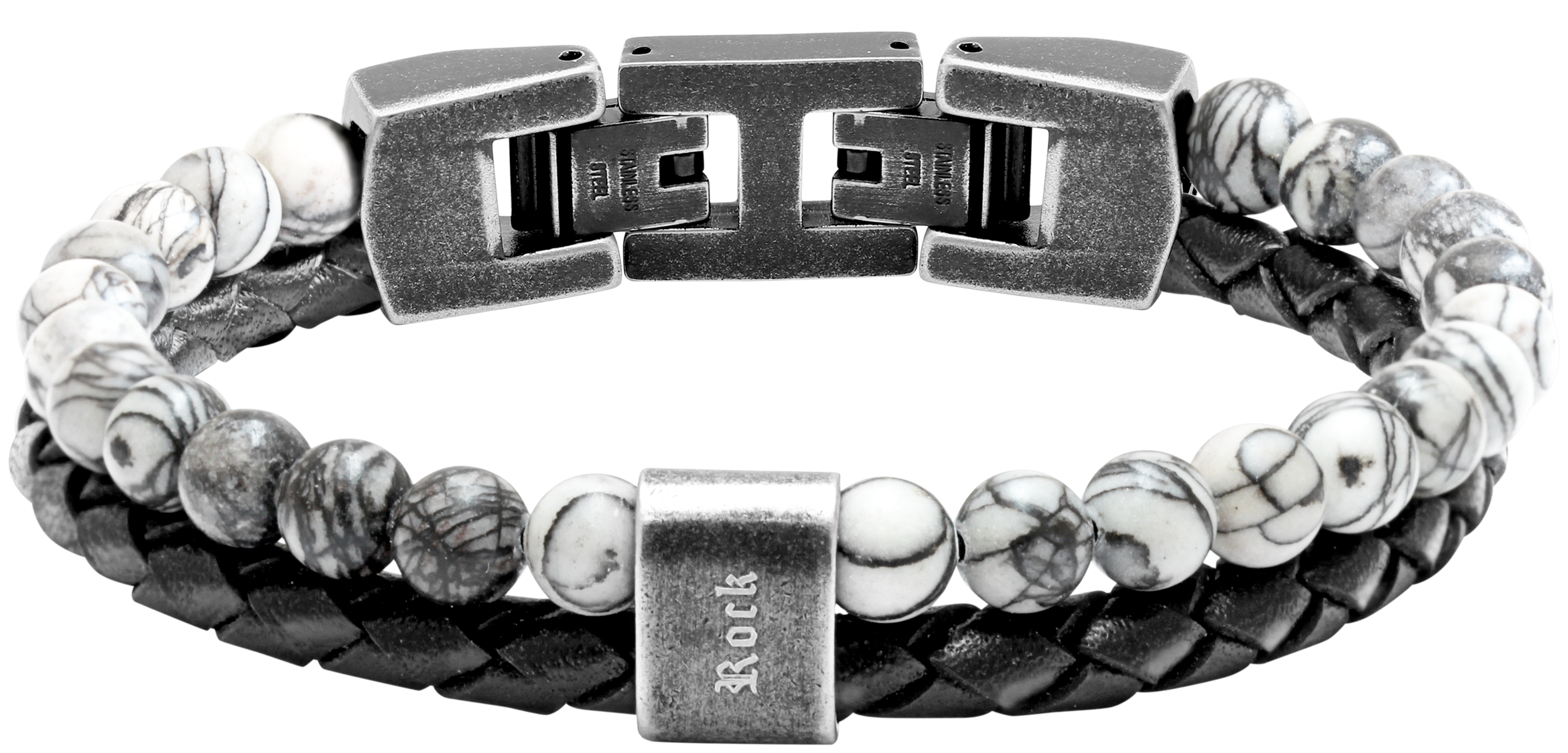 HB562200 KARMA: 13MM BLACK BRAIDED LEATHER STRAP AND GREY JASPERS. "ROCK" ENGRAVING. 21.5CM ADJUSTABLE. RRP $119.95.