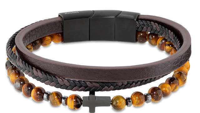 HB891203 Mysteres. 12mm Tigers Eye Beads, PU Leather and Brown/Black PU Leather Link, and Black IP Cross. Magnetic Clasp. 21CM Adjustable. RRP: 134.95.