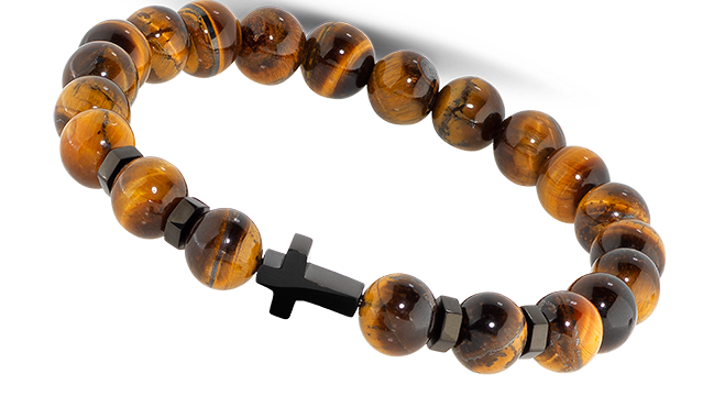 HB89804 MYSTERES: ELASTIC BRACELET WITH 8MM TIGER'S EYE QUARTZ BEADS, AND IP BLACK CROSS. ONE SIZE. RRP $95.