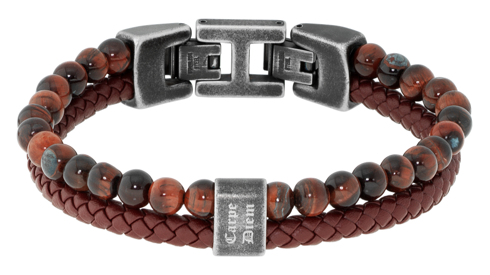 HB562203 KARMA: BRACELET 13MM, BROWN BRAIDED LEATHER STRAP BLACK AGATES AND TIGER EYES BEADS. 21.5CM ADJUSTABLE. "CARPE DIEM" ENGRAVING. RRP $120