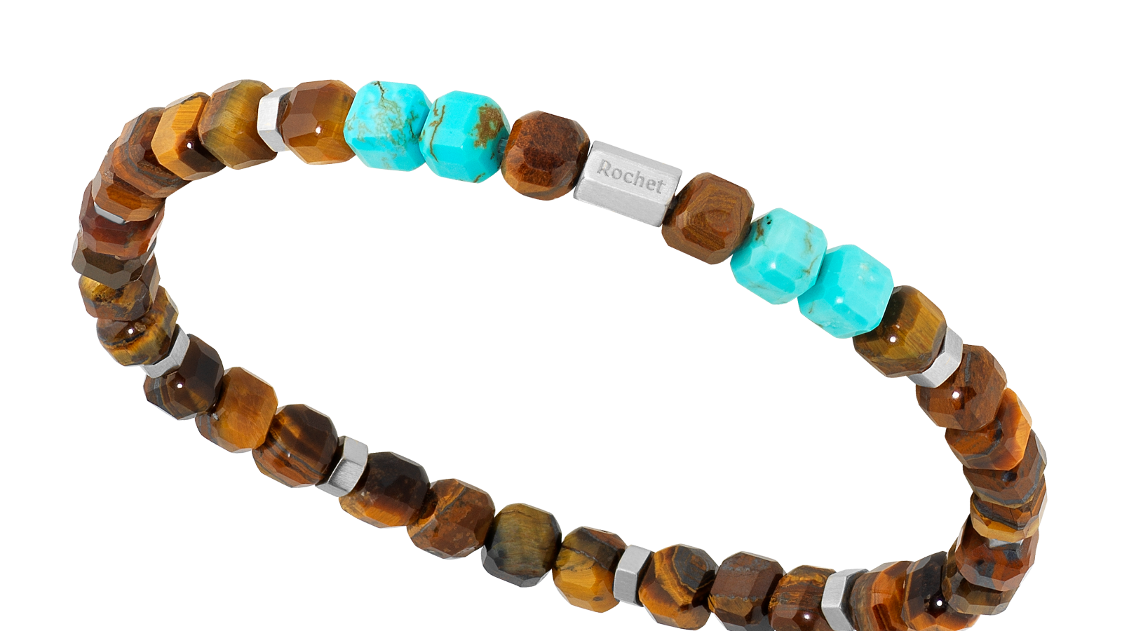 HB9633 BOREAL: ELASTIC BRACELET WITH 5.5MM TIGERS EYE, TURQUOISE & SATINED STEEL. ONE SIZE. RRP $120.
