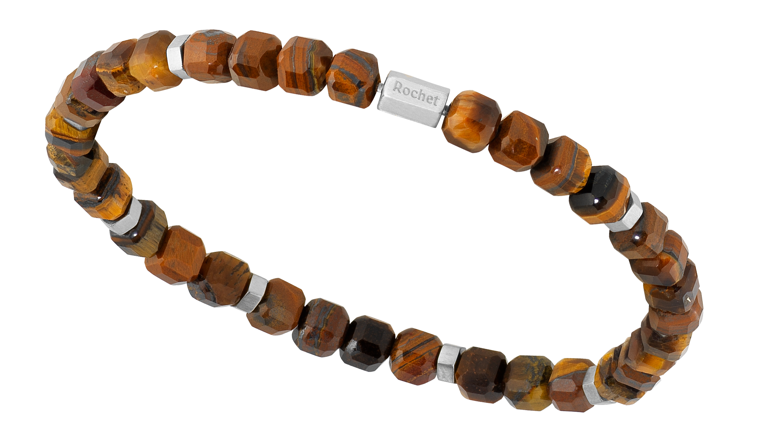 HB2888010 ZEN: BRACELET WITH BEADS, 8MM TIGER EYES, RHODOCHROSITE AND ARABESQUE POLISHED STEEL. ELASTIC BRACELET. RRP $85