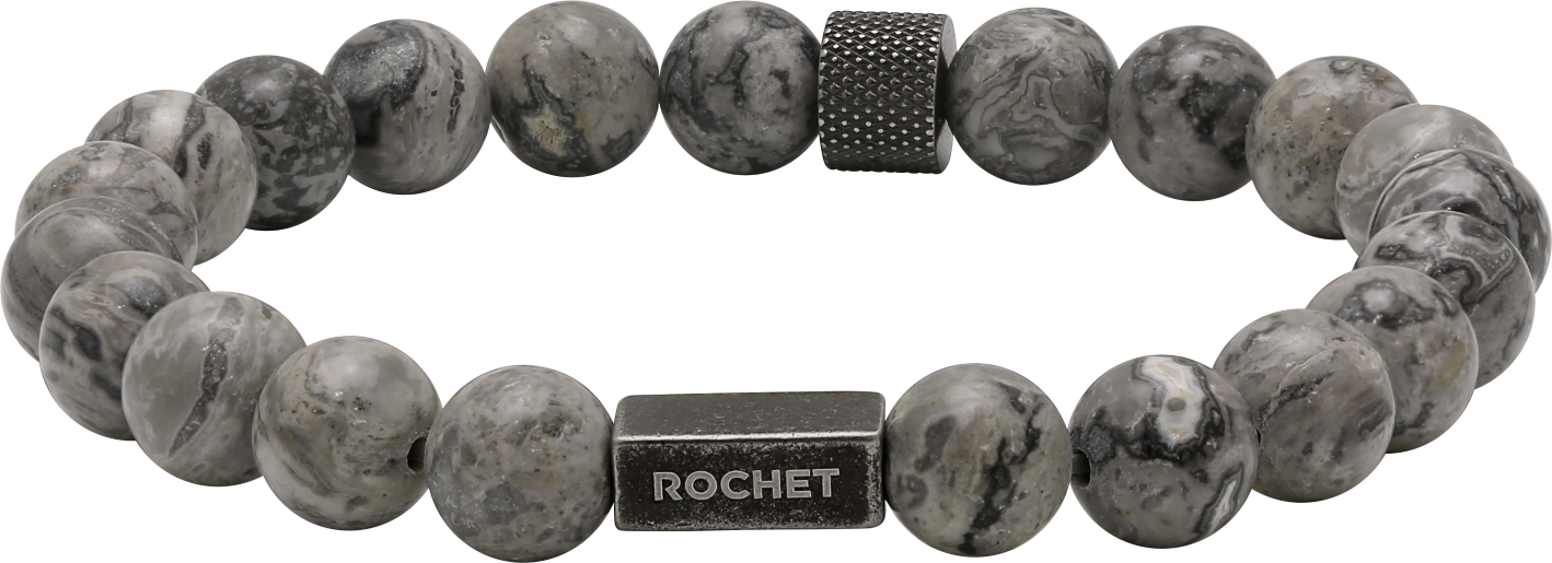 HB2800 ZEN: 8MM GREY JASPERS AND KNURLED VINTAGE STEEL. ELASTIC BRACELET. RRP $85