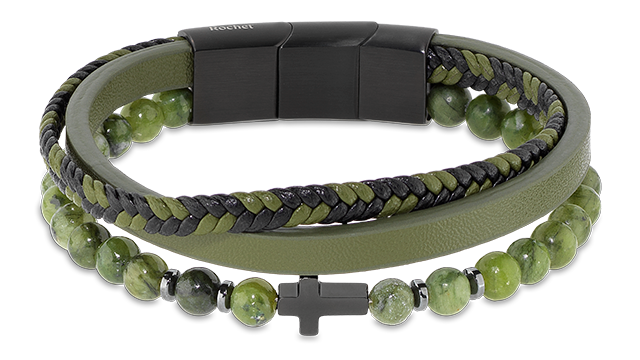 HB891245 Mysteres. 12mm Green Jasper Beads, Khaki PU Leather Link, and Black IP Cross. Magnetic Clasp. 21CM Adjustable. RRP: 134.95.