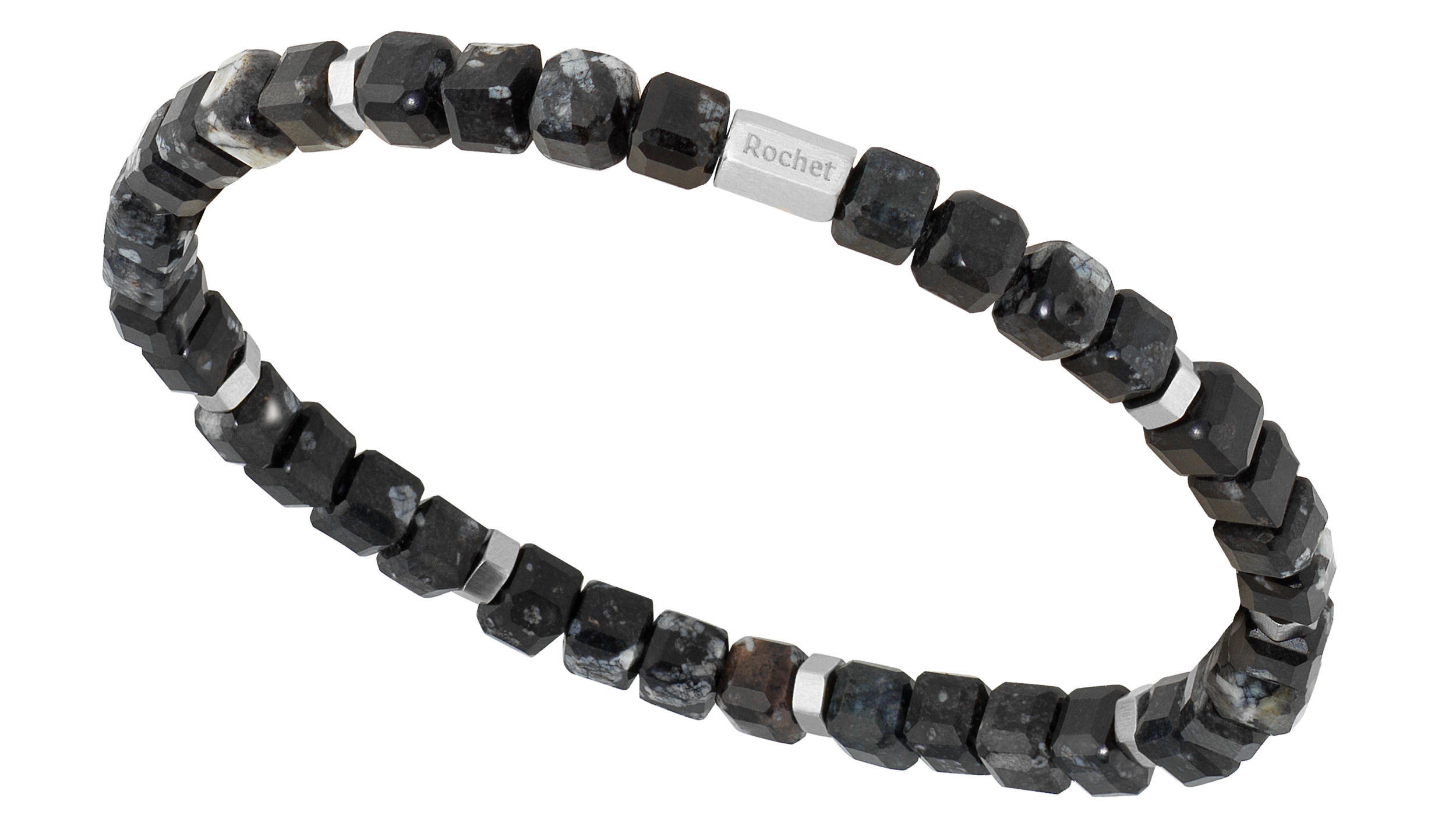 HB9601 BOREAL: ELASTIC BRACELET WITH 5.5MM SNOWFLAKE OBSIDIAN & SATINED STEEL. ONE SIZE. RRP $120.