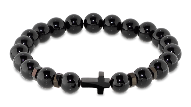 HB89801 MYSTERES: ELASTIC BRACELET WITH 8MM BLACK AGATES, AND IP BLACK CROSS. ONE SIZE. RRP $95.